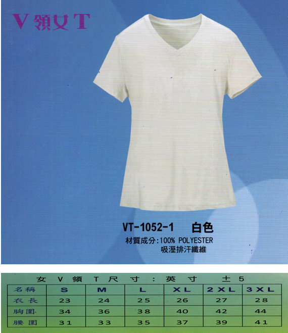 白色女V領T 材質: 100POLYESTER 吸濕排汗衫 SIZE:S~3L
